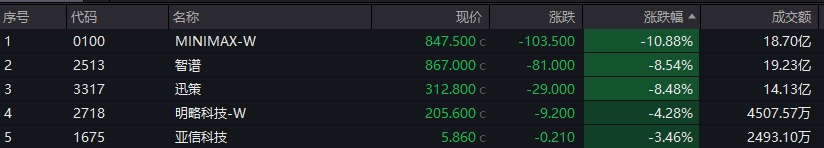 下跌方面,AI应用股走弱,MINIMAX-W跌近11%,智谱跌超8%。