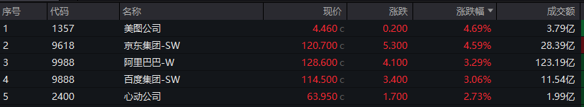 板块方面,权重科技股普涨,京东集团涨超4%,百度集团、阿里巴巴涨超3%。