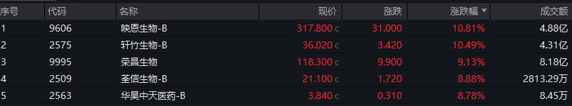 创新药板块领涨,荣昌生物涨超9%,君实生物涨超6%,恒瑞医药涨超4%。